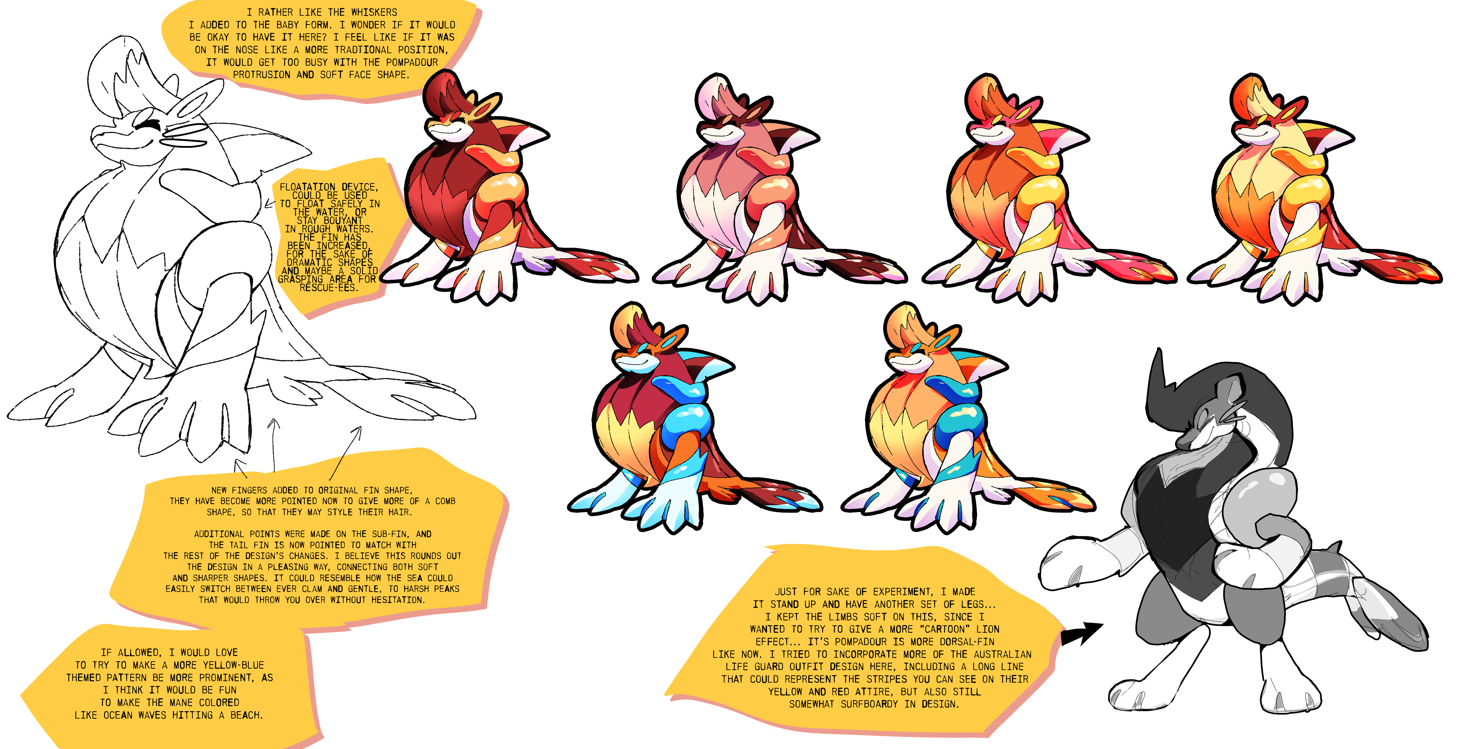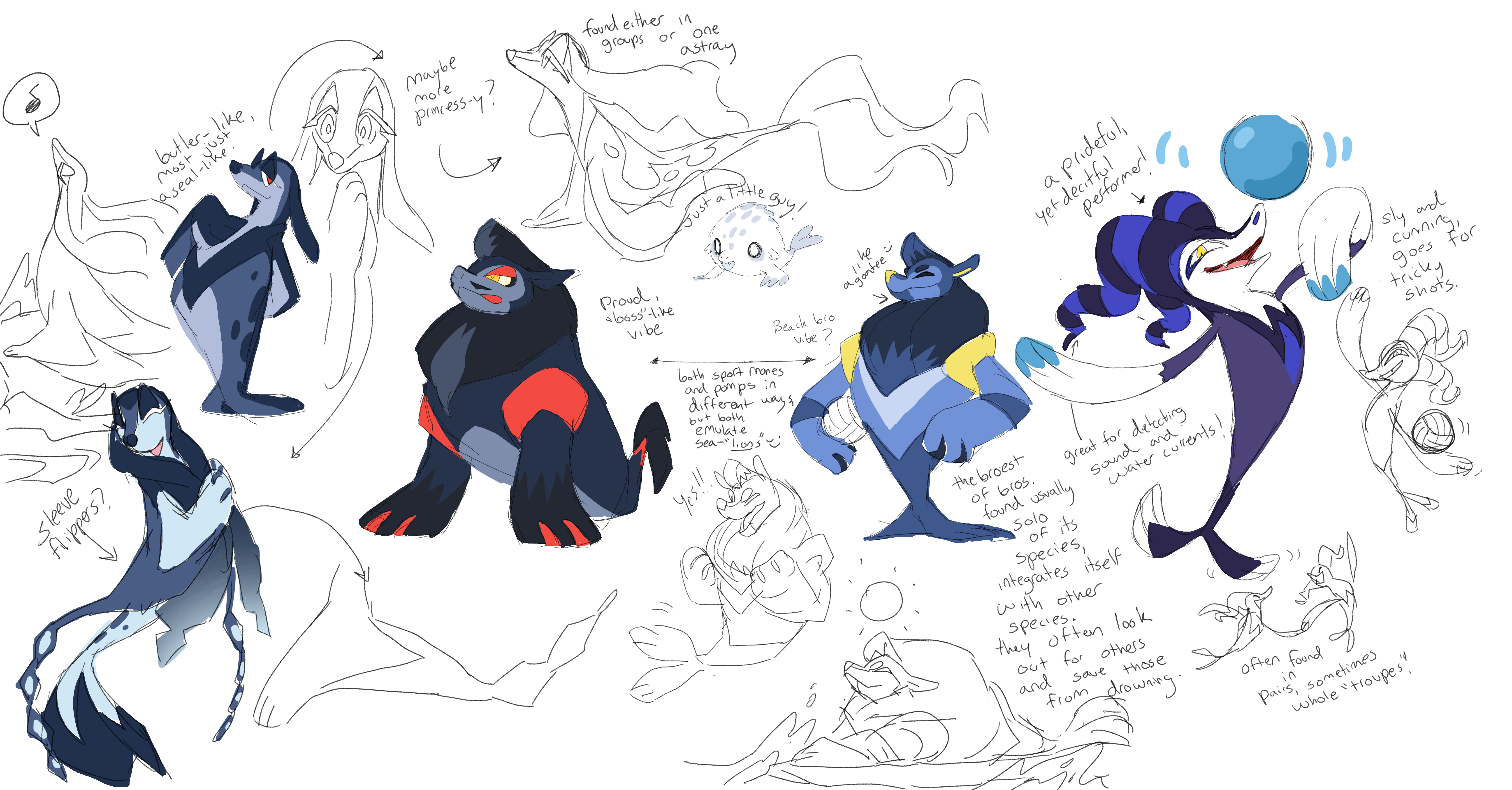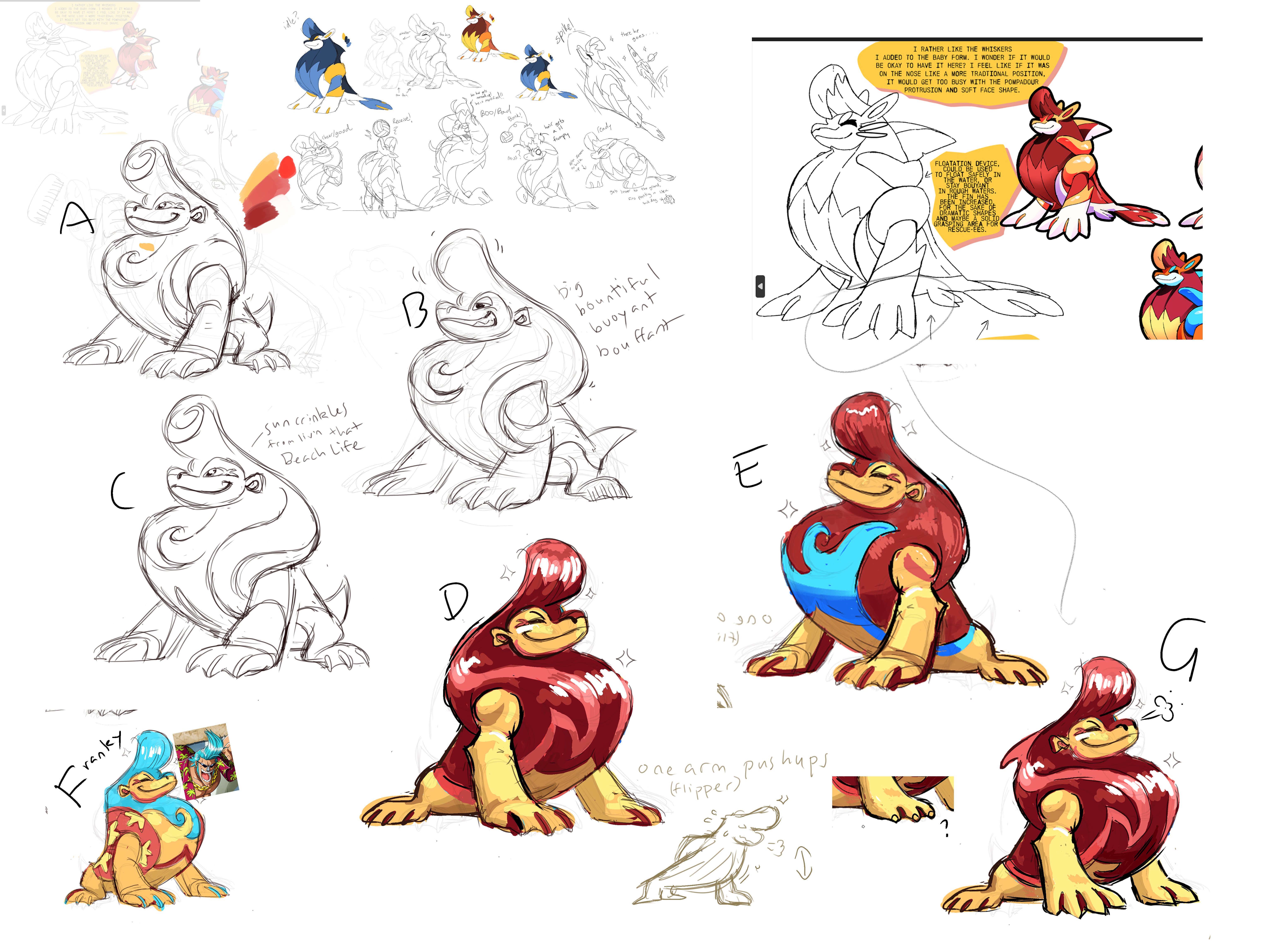 This is probably a great time to mention that Irischroma loves pompadours. I don’t know why, I don’t think there may even be a particular reason. But left to their own devices, Irischroma would often introduce a pompadour somewhere in designs they played with, sometimes even accidentally. And that is what came through here in their development of the beach bro seal, including a first sketch idea for an immature form based on them. Looking at the adult’s sheet, I couldn’t find anything wrong with the designs, and in fact I was really excited by the strong personality already coming across, so I felt that it was basically finished and ready for animation. These are the sketches we used in beta builds for years. But while Alexis loved the personality and poses, she had doubts about the design, so we paused further work on its concept. After a while, feeling like we needed to make some progress on it somehow, we decided to explore more ideas for the immature stage.