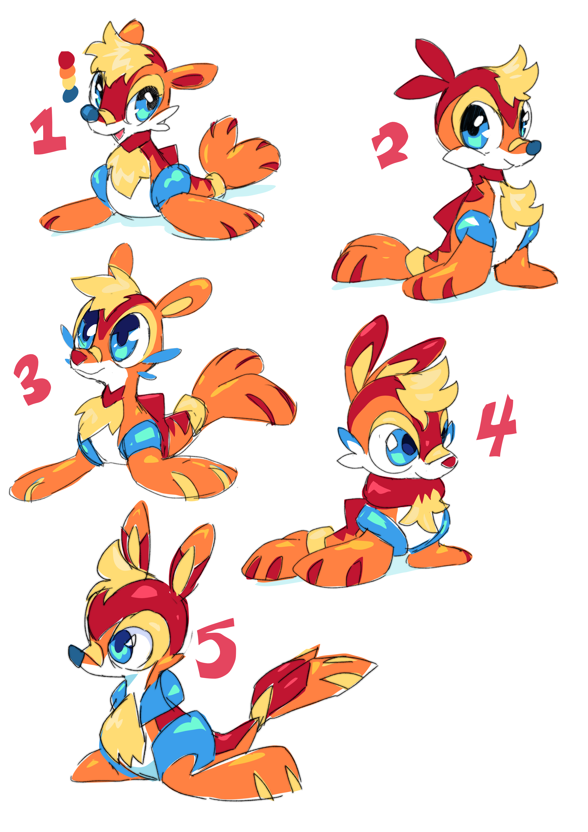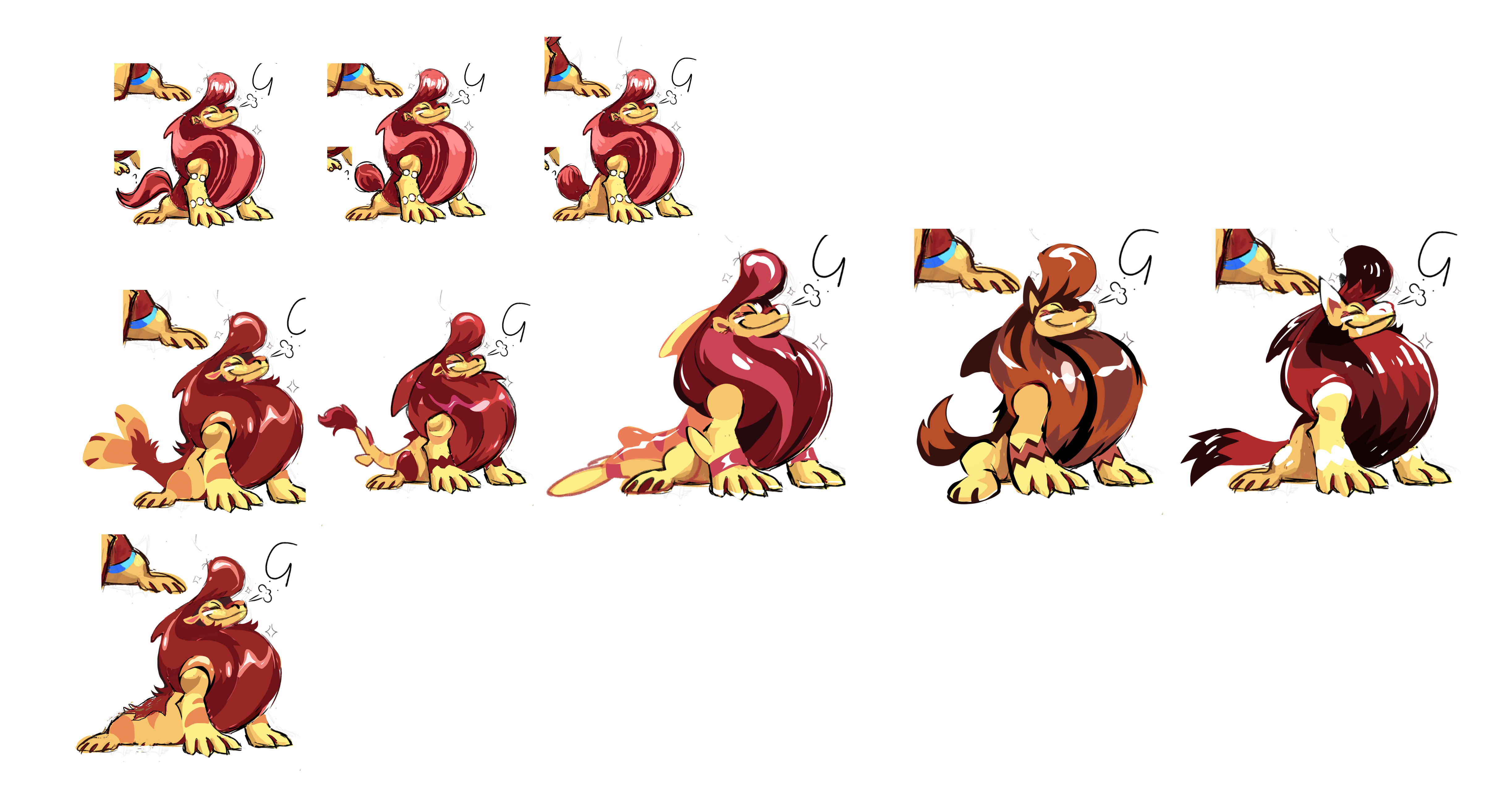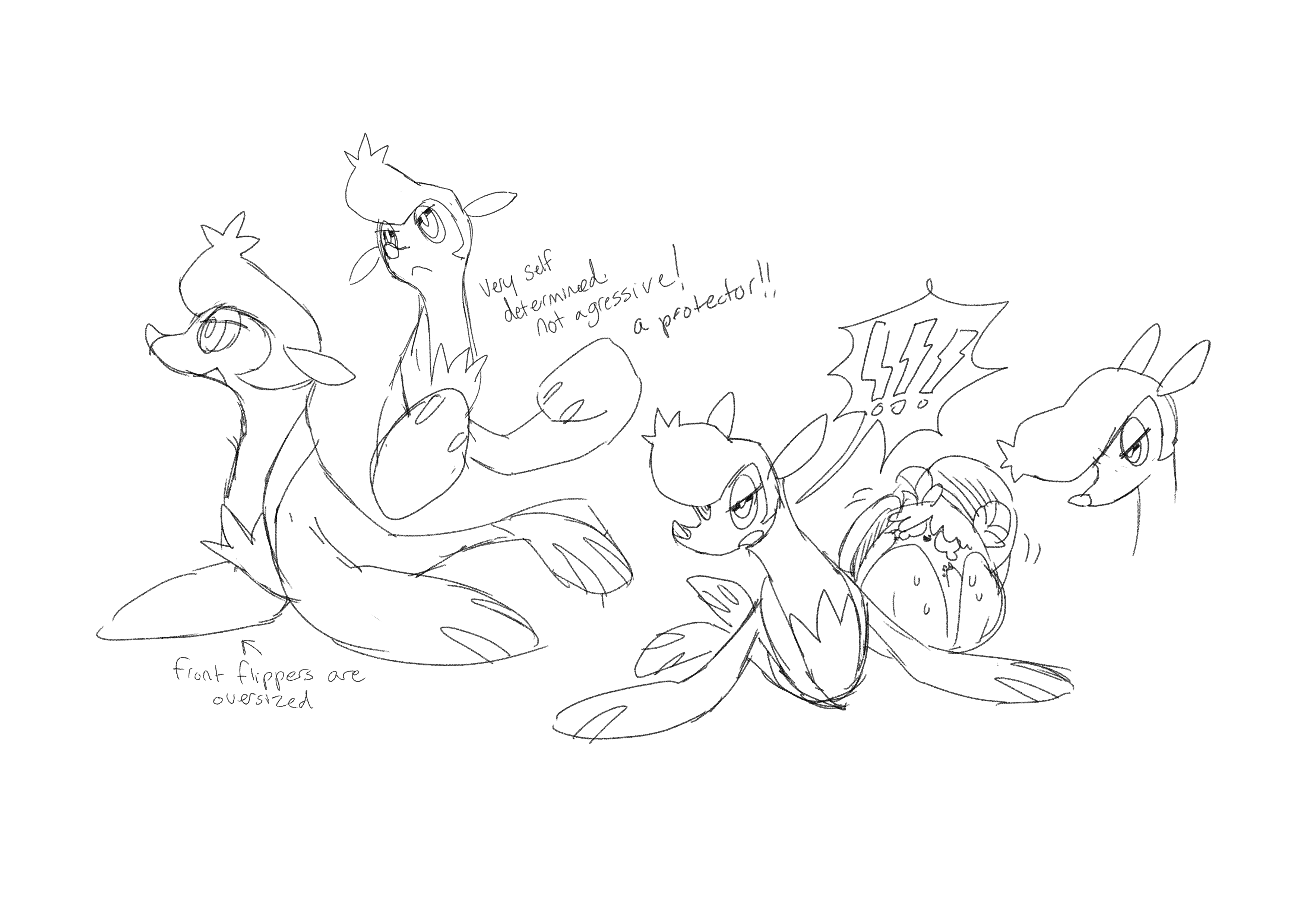 This is probably a great time to mention that Irischroma loves pompadours. I don’t know why, I don’t think there may even be a particular reason. But left to their own devices, Irischroma would often introduce a pompadour somewhere in designs they played with, sometimes even accidentally. And that is what came through here in their development of the beach bro seal, including a first sketch idea for an immature form based on them. Looking at the adult’s sheet, I couldn’t find anything wrong with the designs, and in fact I was really excited by the strong personality already coming across, so I felt that it was basically finished and ready for animation. These are the sketches we used in beta builds for years. But while Alexis loved the personality and poses, she had doubts about the design, so we paused further work on its concept. After a while, feeling like we needed to make some progress on it somehow, we decided to explore more ideas for the immature stage.