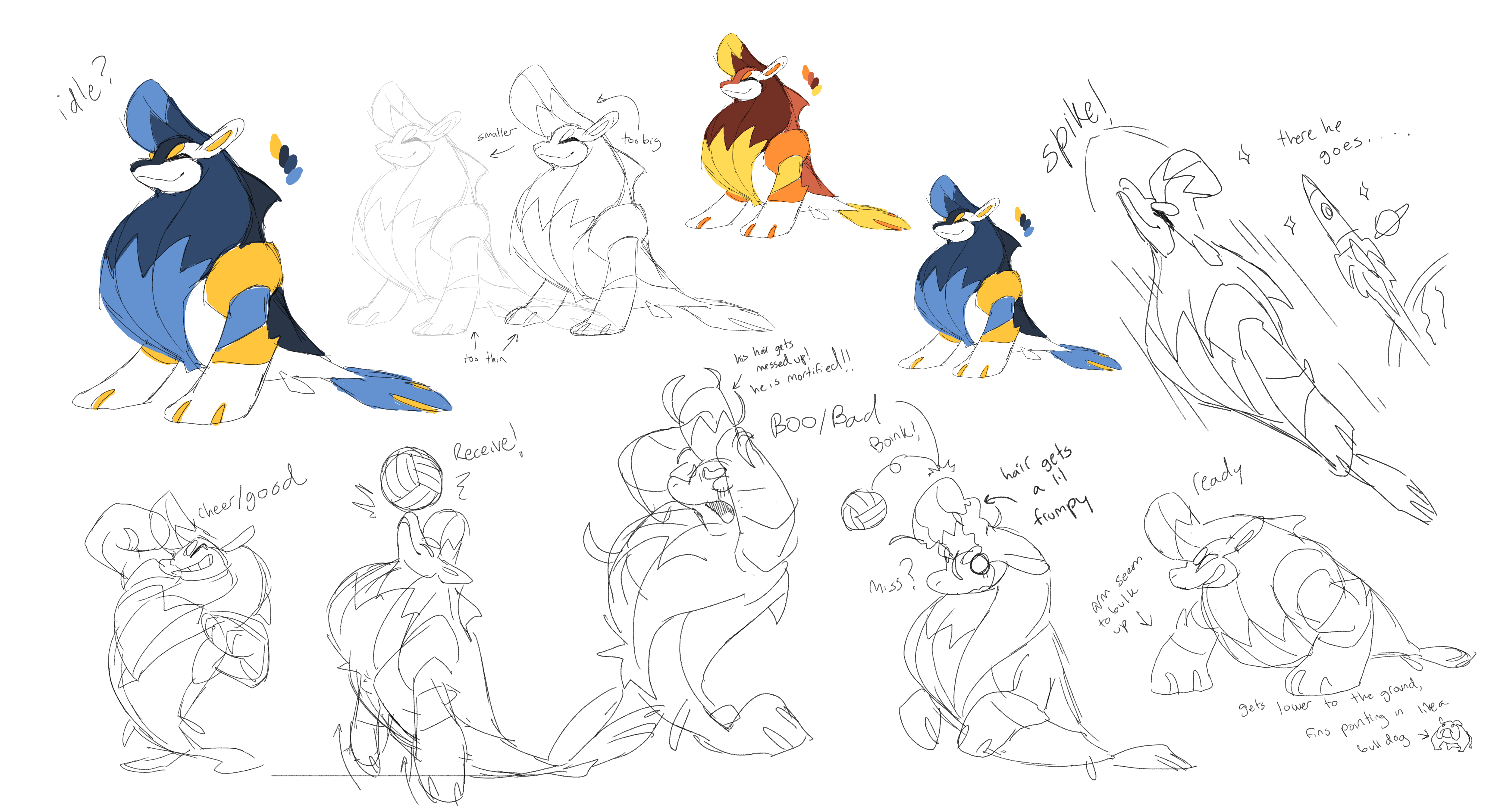 The seal was one of our earliest design prompts I came up with. All I really wanted to go on was a seal’s famous ball-handling ability; I thought they’d make for a great passing/setter-type character. With that prompt, Iris put forward a broad range of possible personas, all of which were appealing right away. But after taking some time to stew on it, we decided to go forward on the beach volleyball-bro character, because they felt like something quintessentially Beastieball which you wouldn’t ever see explored in other creature games (another important direction we were still trying to establish with our early designs).