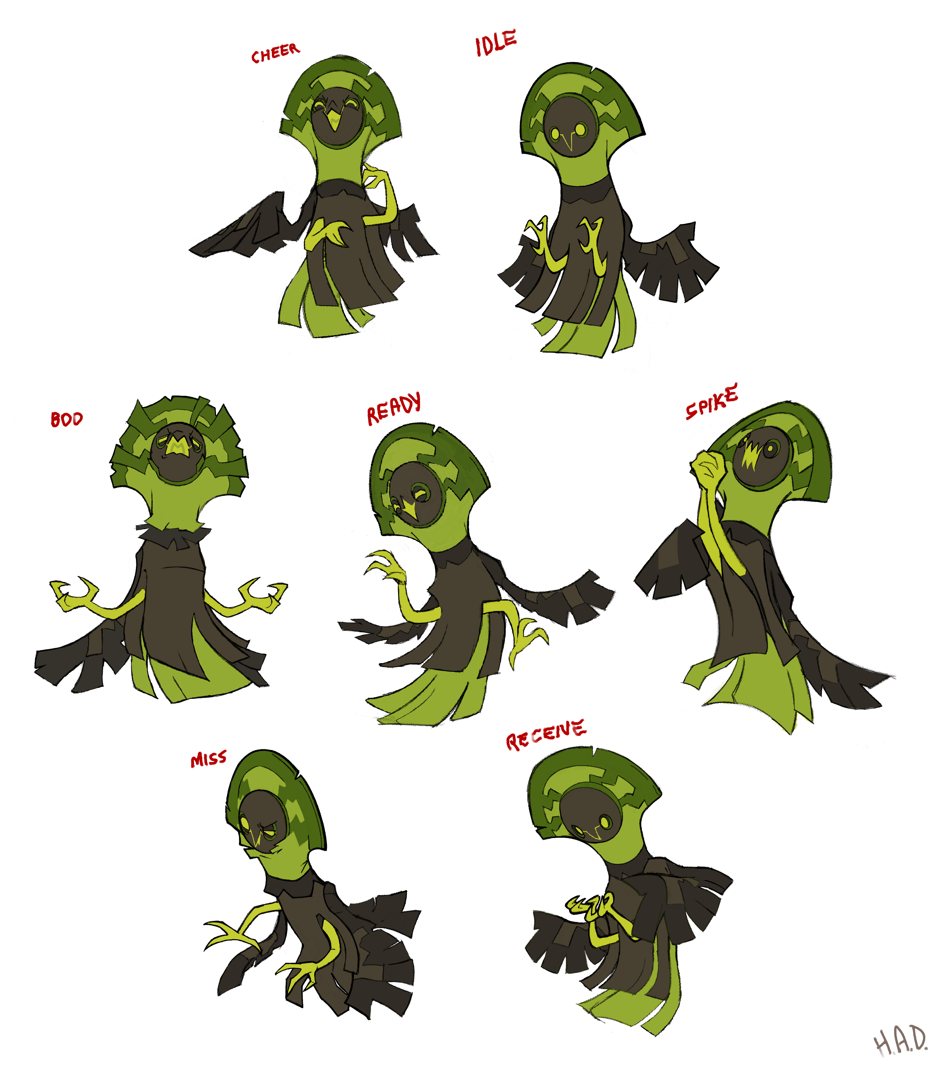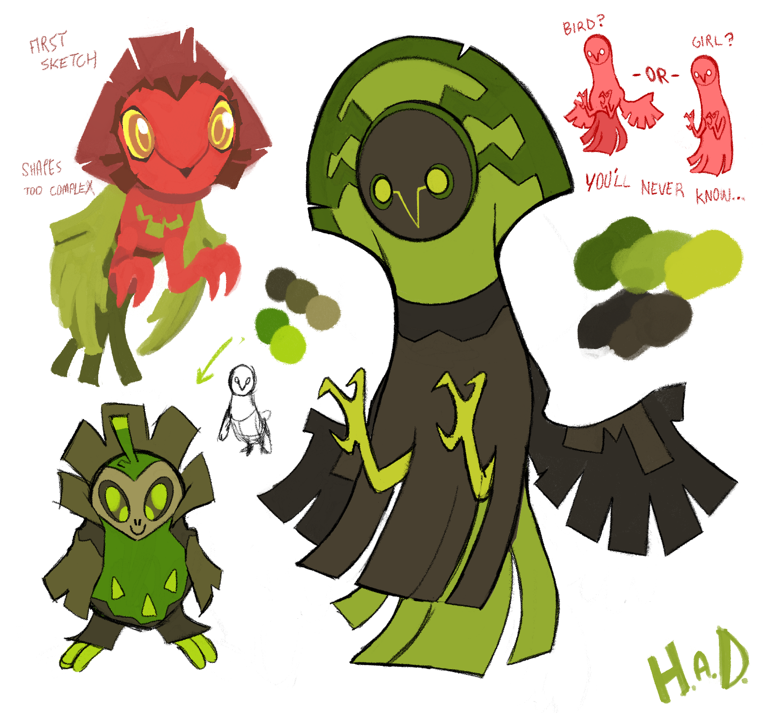 With so few slots remaining for new designs, we never intended to move forward on the “baby” idea Harlow had sketched beside Albrax. But when we got to pondering what the last 3 or 4 designs in the game would be, Alexis did a month-long reassessment of every Beastie we had, trying to identify all the gaps that could still be filled. And one thing she uncovered was that there weren’t any unique birds in the early areas of Mythwood. Another thing she uncovered was that we had an overabundance of “round” Beastie designs, and not enough pointy/spiky ones.