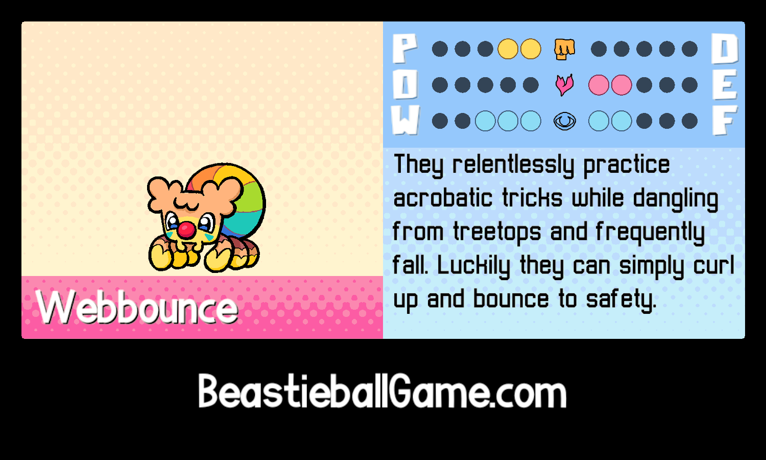 Webbounce has a few unique plays and traits, but for now I’ll reveal just one- their Plucky trait which makes it so that they can’t be given FEELINGs by other Beasties (our version of status effects). They aren’t the most powerful Beastie stats-wise, but their feelings immunity makes them very difficult to impede. No matter what the other team throws at them, you can count on them to get the job done!