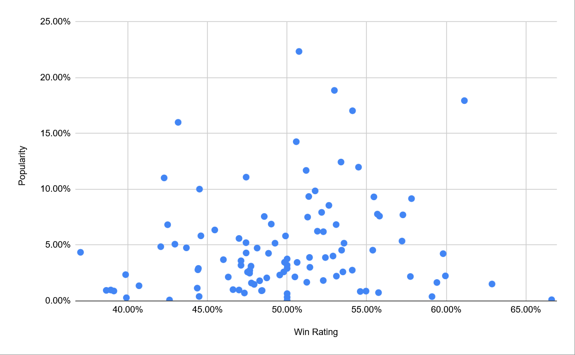 Each dot here represents a Beastie with a certain trait; so Daredillo with the “Self-assured” trait is a separate dot from Daredillo with the “Acrobat” trait, acknowledging their different playstyles are effectively different characters. Higher dots are used more often, and dots further to the right win more often. If we narrowed our data to only include top-level players, especially as the game is out for longer and the meta advances significantly, you’d expect this chart to show more of an upward slope where the Beasties that win more often also are used more often. But what we see isn’t like that, because players generally choose their Beasties by personal preference, and there aren’t any that are predominantly known to be better than others.