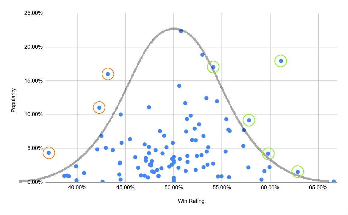 But those dots we’ve circled in orange are performing outside the curve—across many players and games, they’re clearly losing more than they win. And it’s similar with the dots circled in green: those ones are clearly and consistently winning more often. So this data gives us a strong starting point to figure out what Beasties we want to target with changes, either to buff or nerf. It isn’t strictly binary… dots close to the edge on either side likely need attention, and any change we make try to should account for precisely how far off expectations that Beastie is.