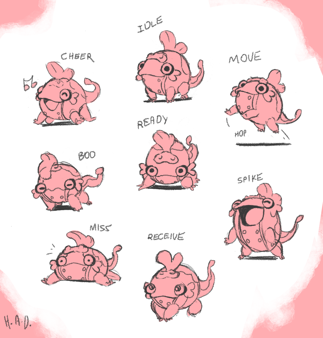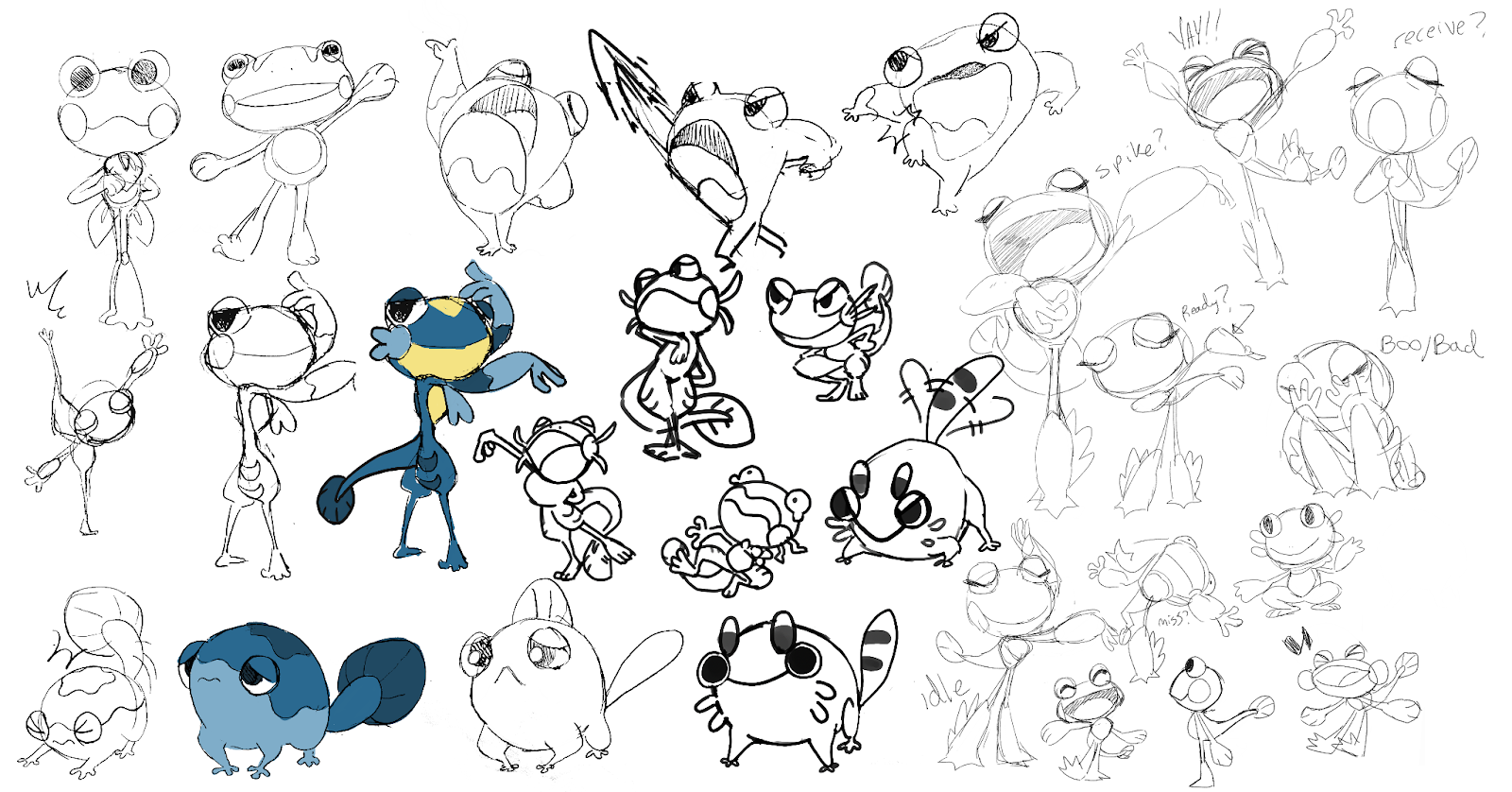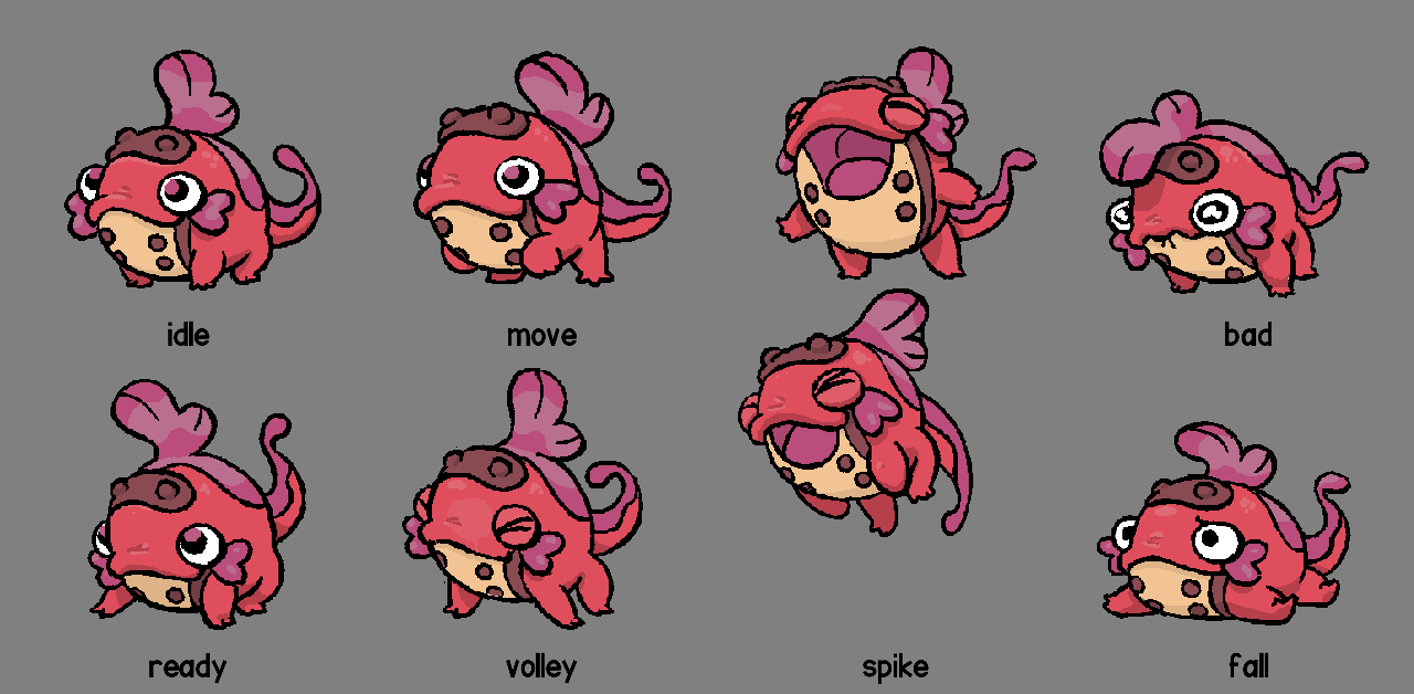 Alexis: We ended up making this Spike into the Cheer pose because it was soo cheerful, and coming up with a headbutt Spike instead. For the in-game drawings, I tried to keep all the charm of these, but for gameplay clarity I rotated them a little to match the angle of the idle.