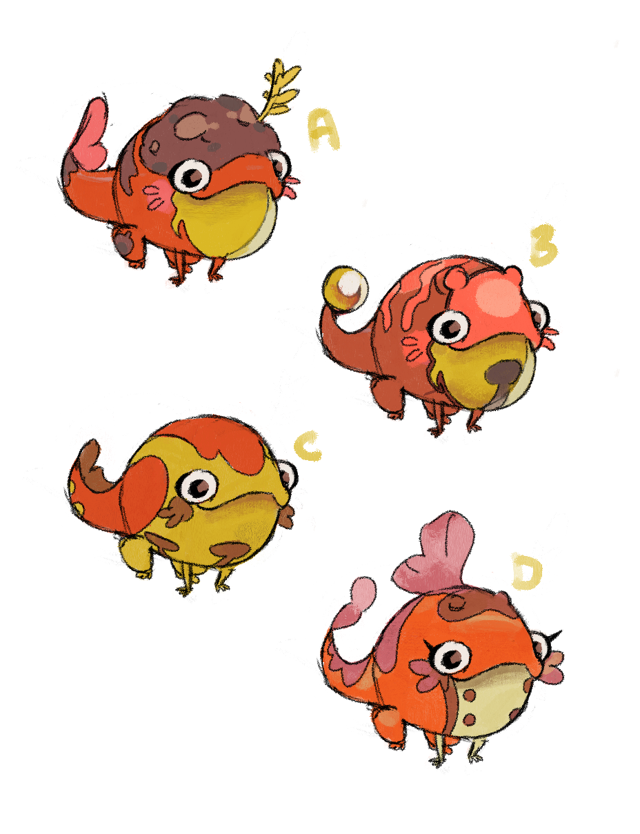 Greg: From there it was time to go back and re-think the first stage. Using some of Tia’s earliest drawings as a base, Harlow tried out a variety of ideas! We were still playing with species at this point - with “frog” as a starting point, it still felt on theme to branch out into tadpoles, axolotls, etc. Beastie designs are rarely inspired by just 1 animal.