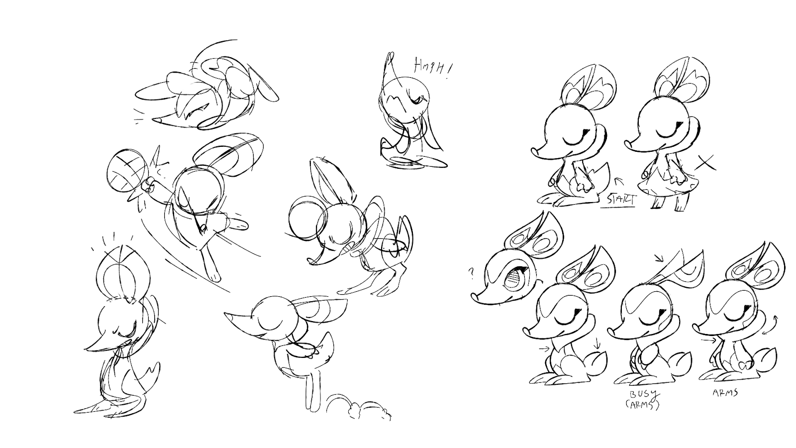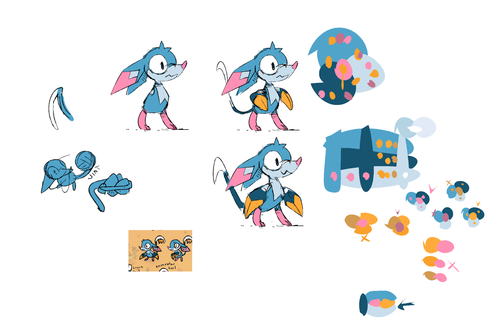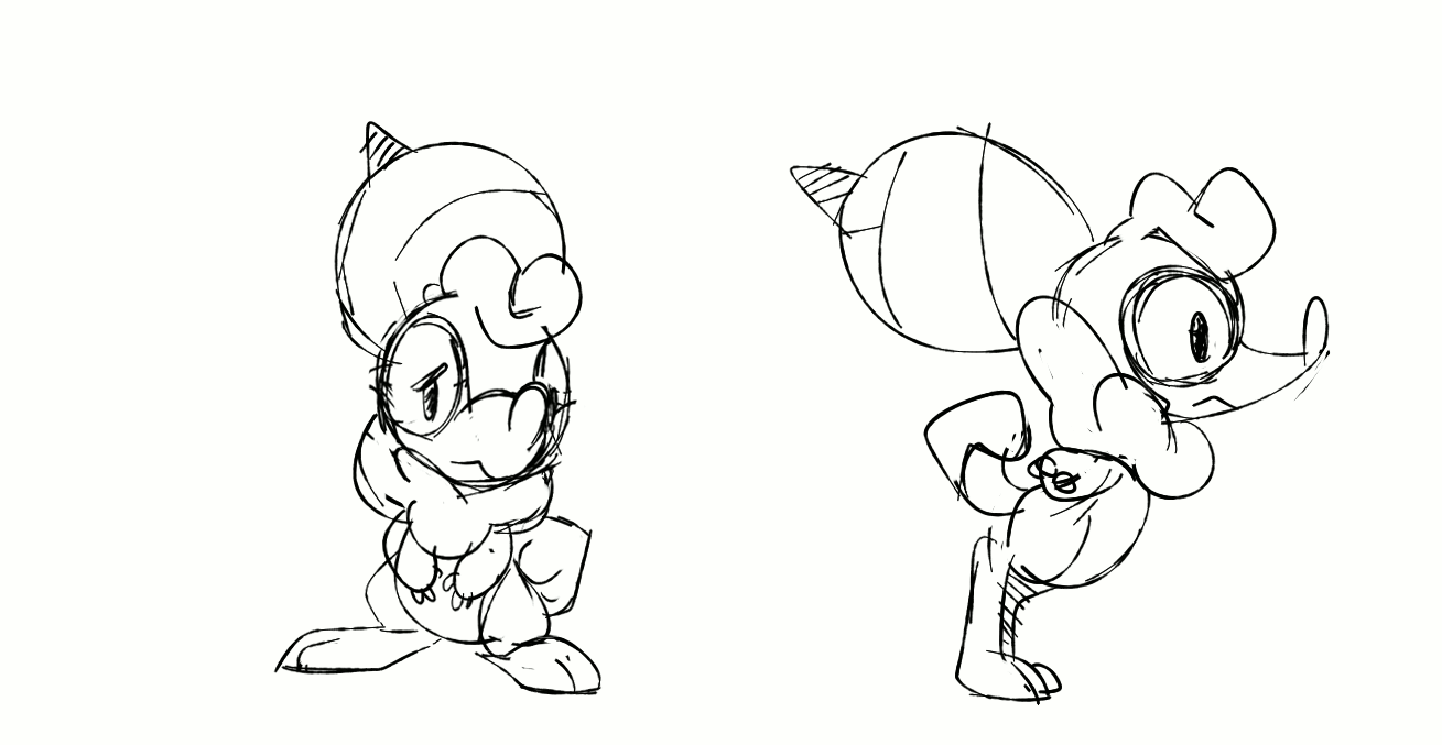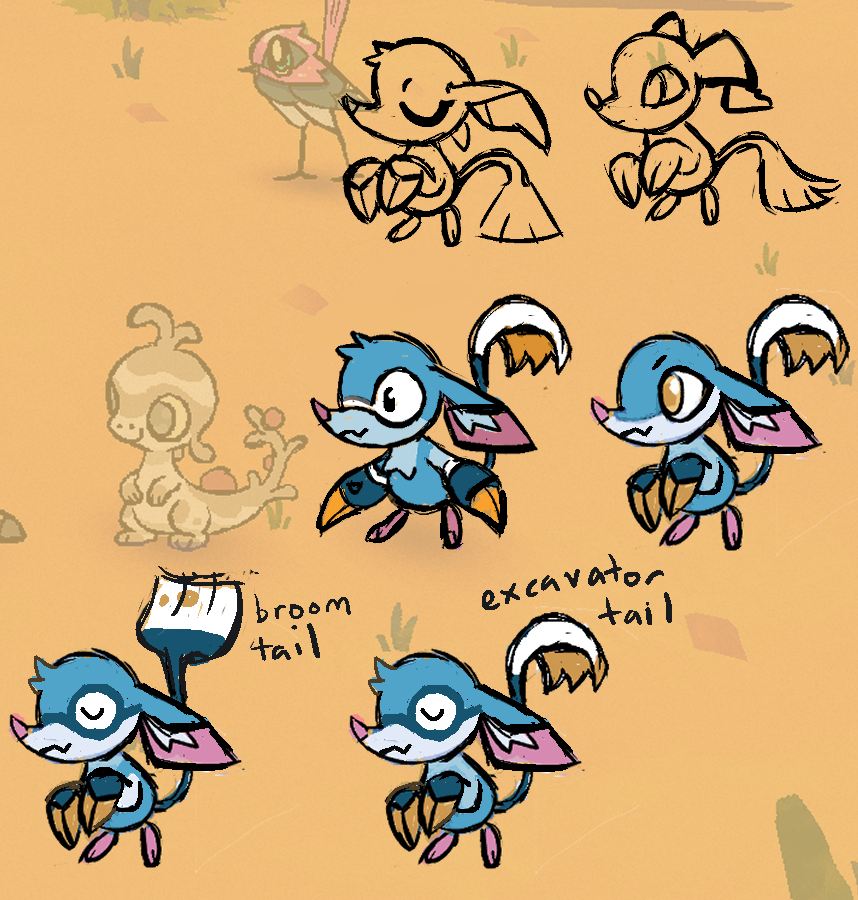 Greg: Twarda sent us this idea back after playing with Alexis’ design ideas. A strong new personality was starting to emerge with its nervous/anxious/overthinking energy that set it apart from the other 2 starters. The “digging” theme was harder to convey visually, but it was a much more natural fit. After going through so many iterations, it was hard to know if we were actually getting anywhere with it - but these drawings were exciting to us and felt like they could be the one!