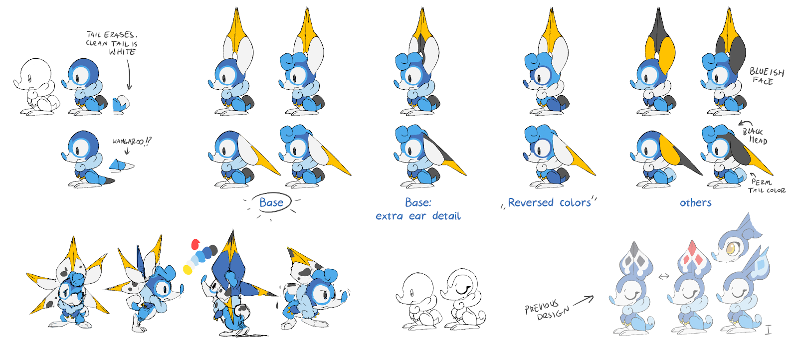 Greg: At this point we had ideas for an amphibious (pink) Spirit starter and a bird (yellow) Body starter, but no (blue) Mind starter - which we’d been thinking should be a mammal to round out the starter roster. These sketches fit the box perfectly, so we decided to rethink them as a 3-stage Mind starter!