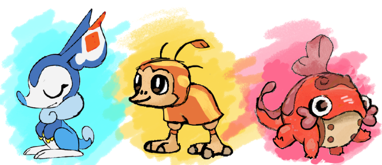 Alexis: I had originally been going for sort of a kids’ soccer team outfit, with a shorts-like body shape and a vertical stripe along the side. The feather on the head is a nod to a theme that appears in their grown-up form, which… To be frank, doesn’t really come across, even if you know what that form is haha! I felt like it wasn’t quite finished, but wasn’t sure where to go with it, so I stopped looking at it for a while and focused on other designs.