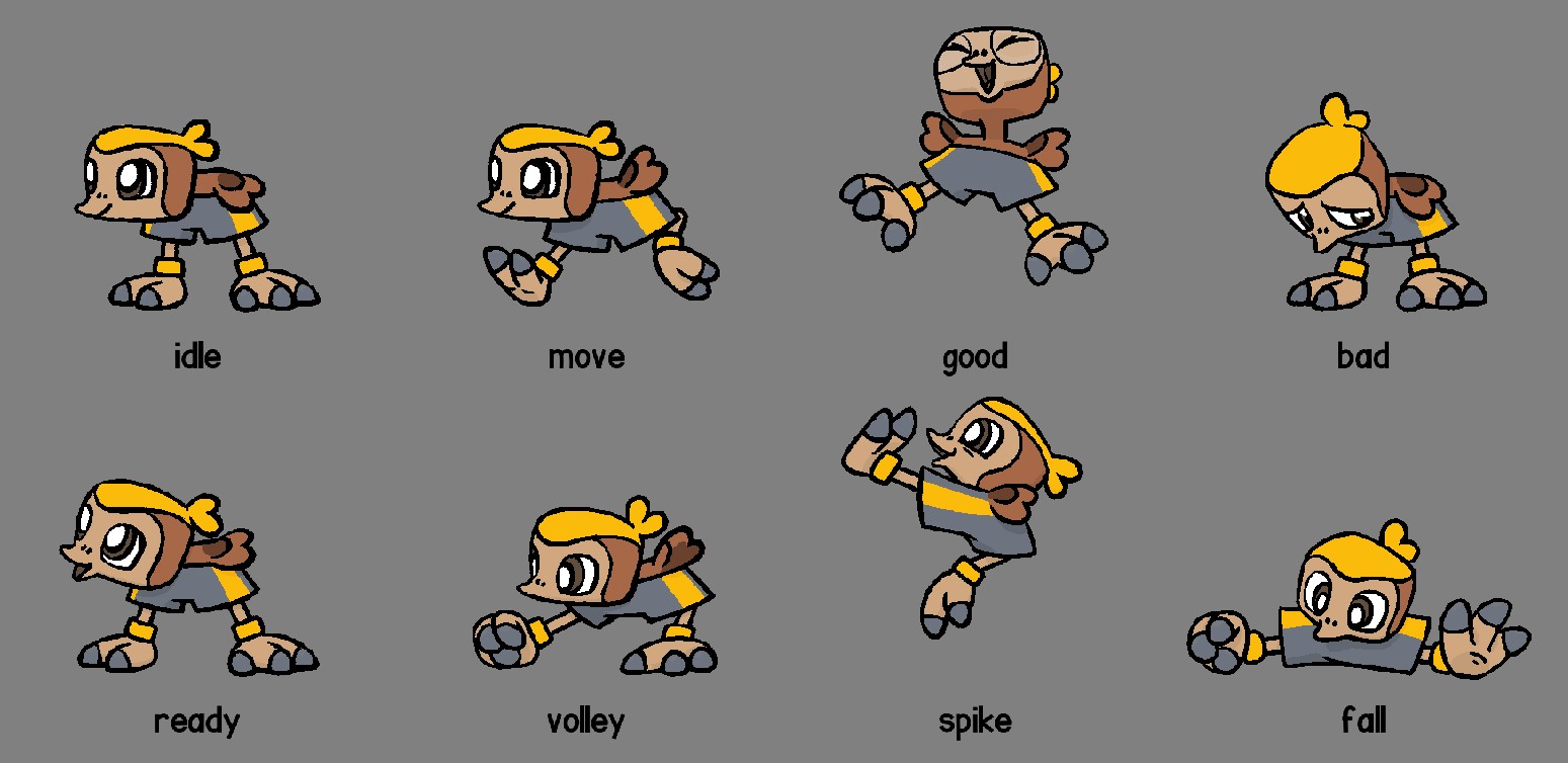Greg: The game starts by having the player choose their first Beastie from a set of 3 - this is something Pokemon does too, and it’s frankly good game design that we couldn’t improve on. You want players to choose their own Beasties so that they feel a personal connection to them; and 3 is the perfect number of choices (just enough to have a “favorite”, but just few enough to not be paralyzing). So before even a single design was done, we knew we needed 3 “starter” Beasties at some point. Once I saw these sketches, they seemed like a natural choice as a “starter Beastie” since they perfectly encapsulate the “sports + animals” theme of the entire game - most designs get a lot more loose with that premise.