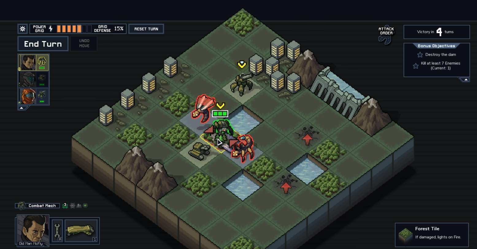 This speaks to a trend I’ve observed with a lot of recent high-profile, designer-friendly games like Slay the Spire or Into the Breach. In the above Breach screenshot, while the player is selecting their actions for their turn, they can already see red arrows indicating exactly what every enemy will do; the two bugs highlighted in red will attack a player unit, and two new enemies are about to come up from underground on the right side of the board. Players are allowed to strategize their actions however they want already knowing exactly what their opponent will do. It creates a satisfying, crunchy space almost more akin to a puzzle game than a strategy game.
