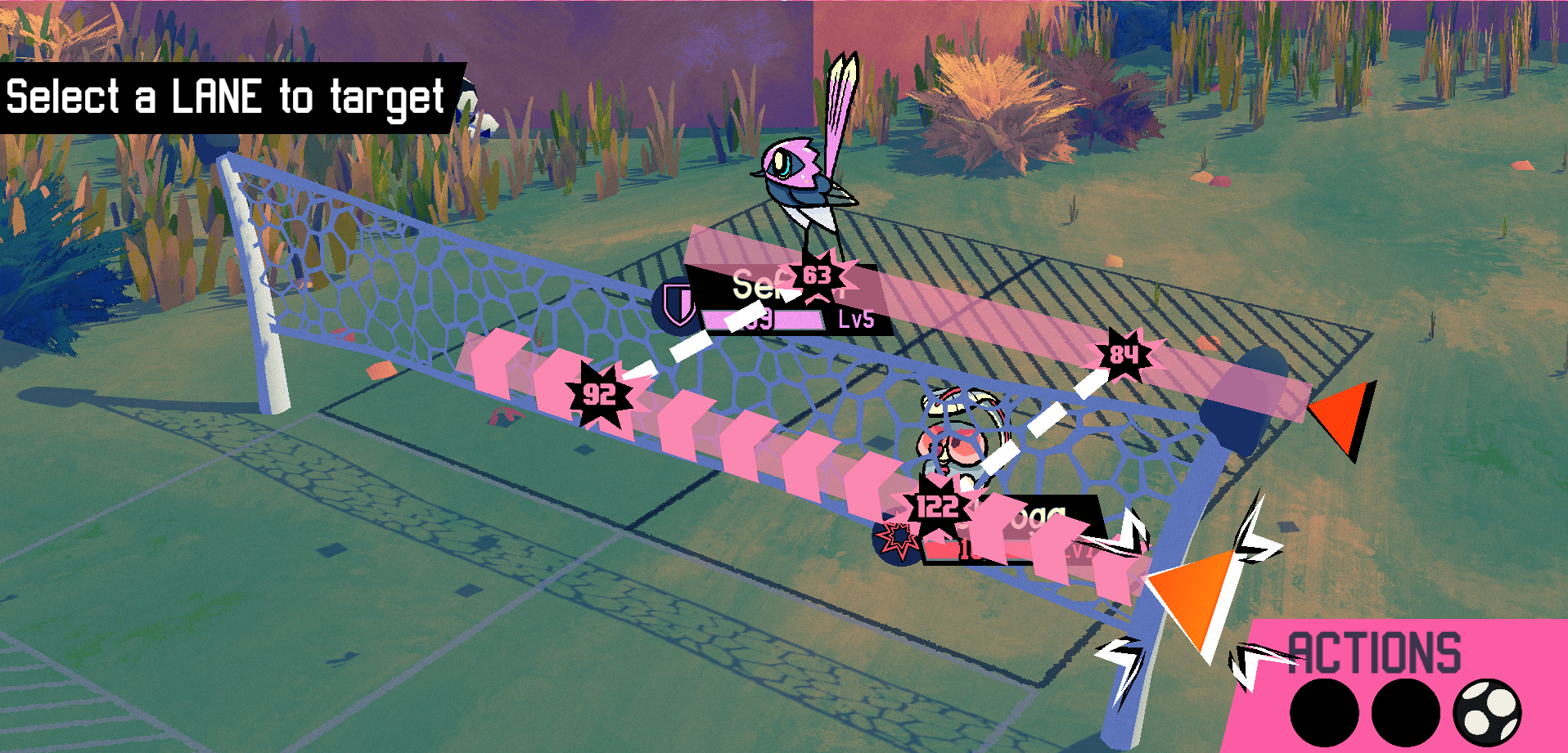 This was the basis for the lane-based targetting system. Rather than targetting an opponent, you hit the ball across a lane or row of the field, and the attack is received by the first Beastie standing in the ball’s path. Beastie’s field position has an impact on their power and defense, too; Beasties at the net do boosted damage but take extra damage, too. Altogether it adds just a tiny bit of complexity and ambiguity, enough to create space for mind games.