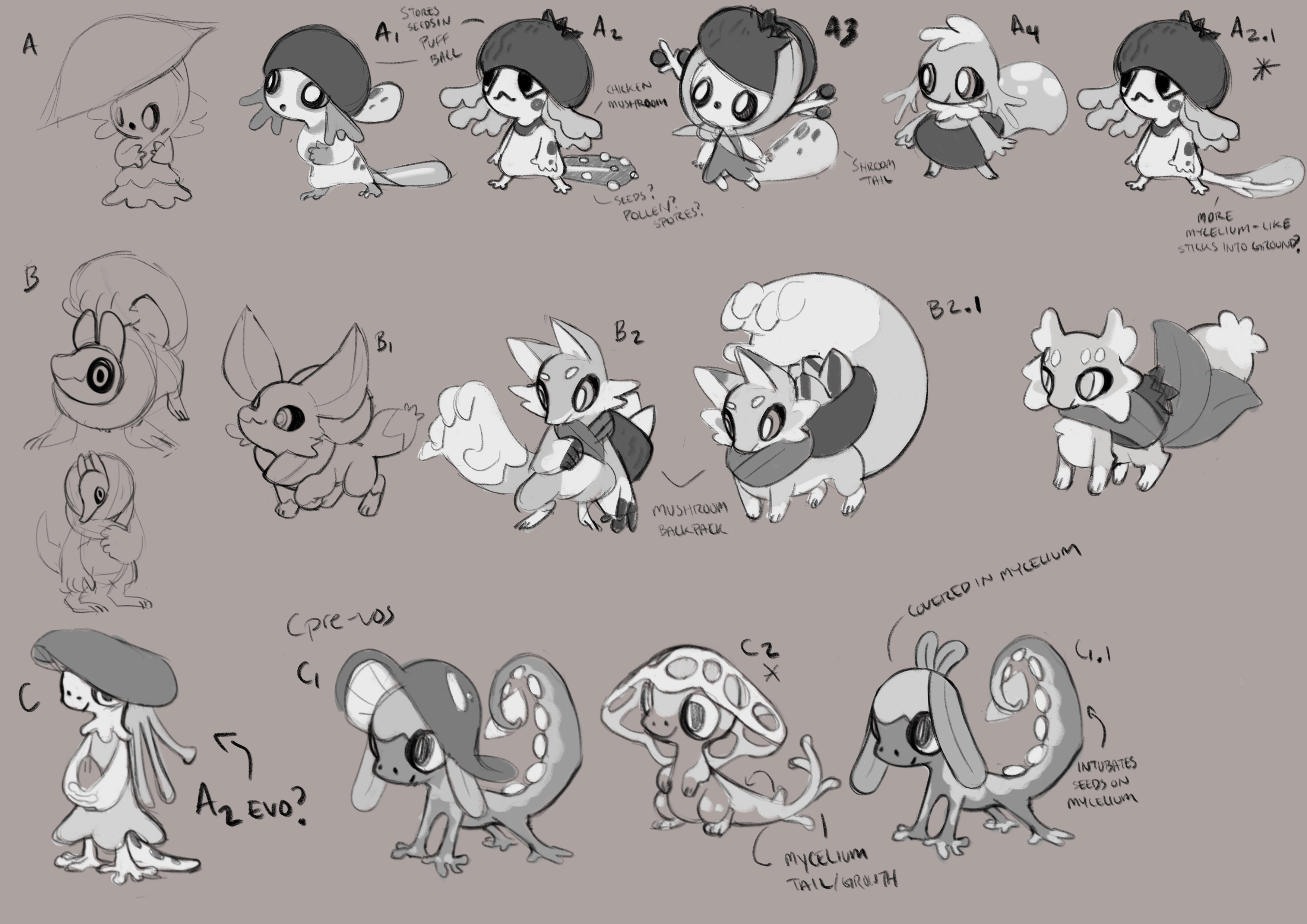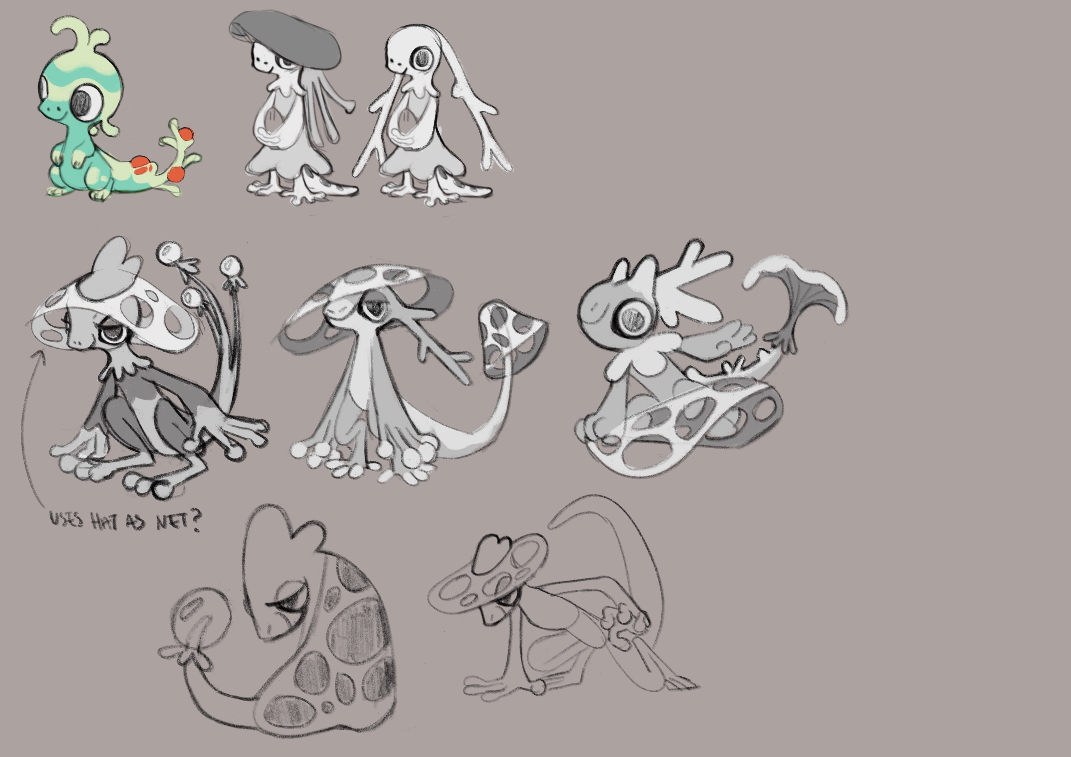Even amidst all the ideas on this page, this was when a lot of the team came together and agreed that “C2” had something special going on. The only thing nobody could decide on for themselves was whether they liked the hat full of holes; it looked complex, and a bit scary. But its contrast with the chibi monster was also what made it appealing. We didn’t know what to do with it, but we told Tori to go and make more of it.