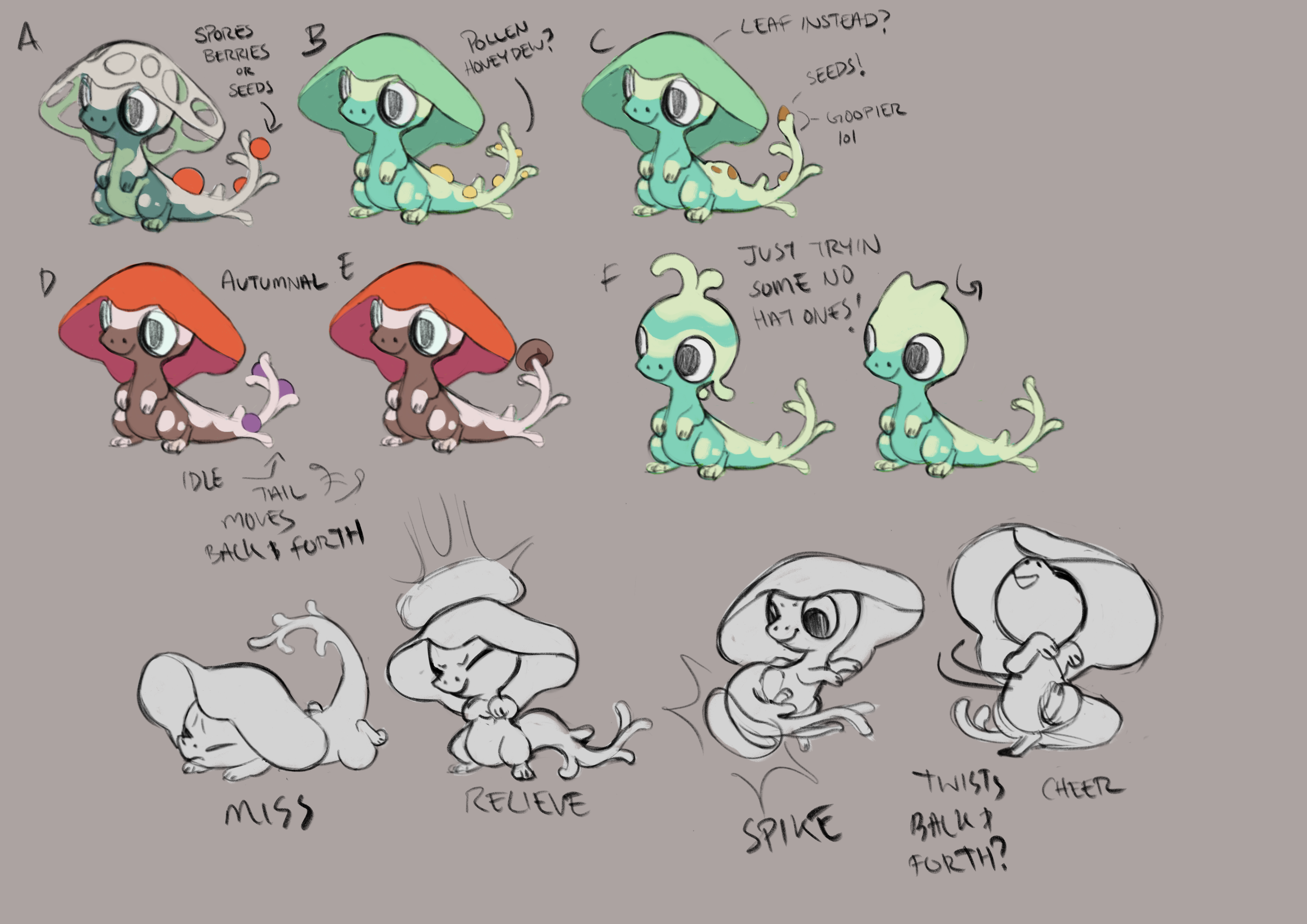 And that’s when all the ideas that would be combined into Sprecko finally emerged. On first impression, almost everybody liked the leaf-hat idea, but as we sat with it for longer, we decided the “sprout” head fit best. It was the perfect mix of conveying immaturity, while being a bit weird, but still very simple. By adding berries to the tail, we could create a complex and colorful focal point to add just a bit of flavor to an otherwise plain design. Alexis took the reins from here, making some tweaks to the proportions and bringing Sprecko to life.