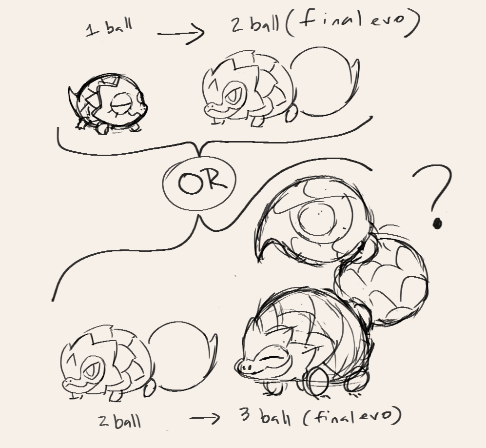 Alexis identified two possible directions, with a very geometric theme centered on the count of “ball” shapes; either 1 to 2, or 2 to 3. Laid out like this, we could see that the “3 ball” sketch had a clear theme/pattern to follow, whereas the “1 ball” design was kind of a themeless nothingburger, so we decided to pursue a “3 ball” idea as the additional form for this Beastie.