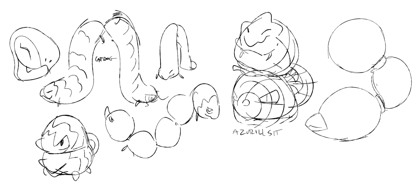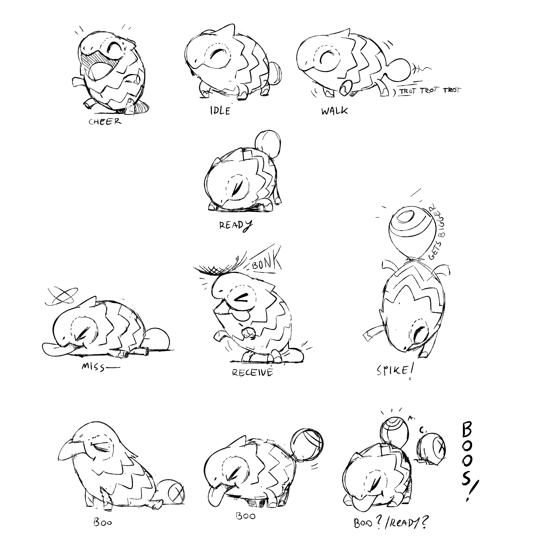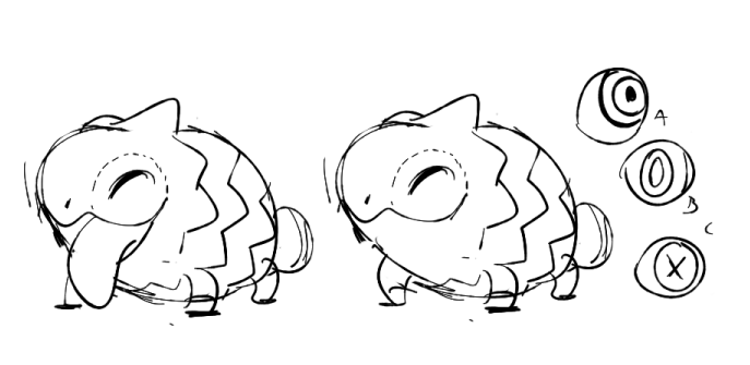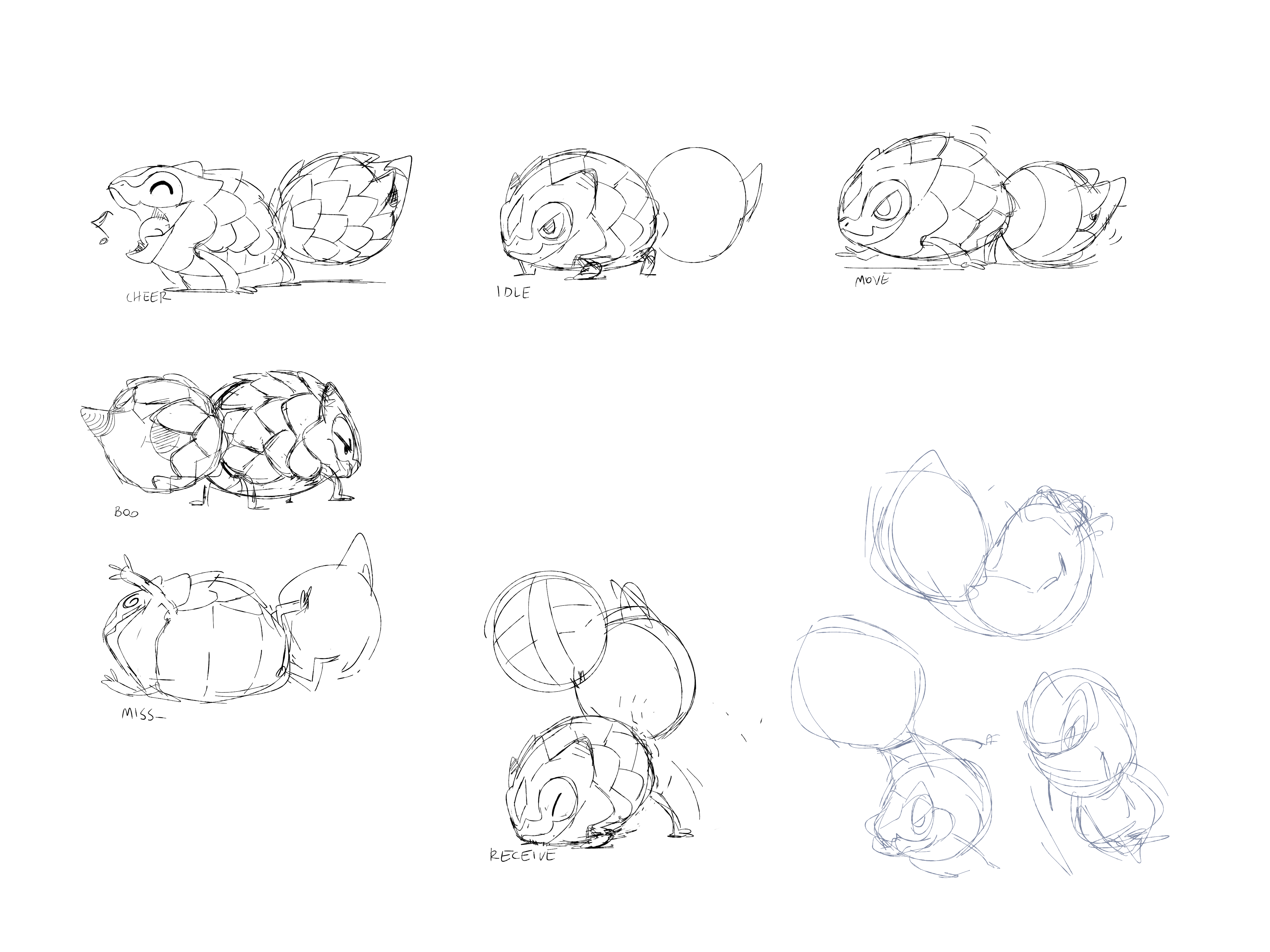 Twarda started exploring what we could do with a limited range of motion, or how we could adapt the size of the body vs. the joint vs. the tail to find a decent middle ground of appeal and practicality. Nothing looked particularly bad, but nothing felt like it was hitting as well as it had in the sketch, and we started to worry the design was simply broken on a fundamental level.