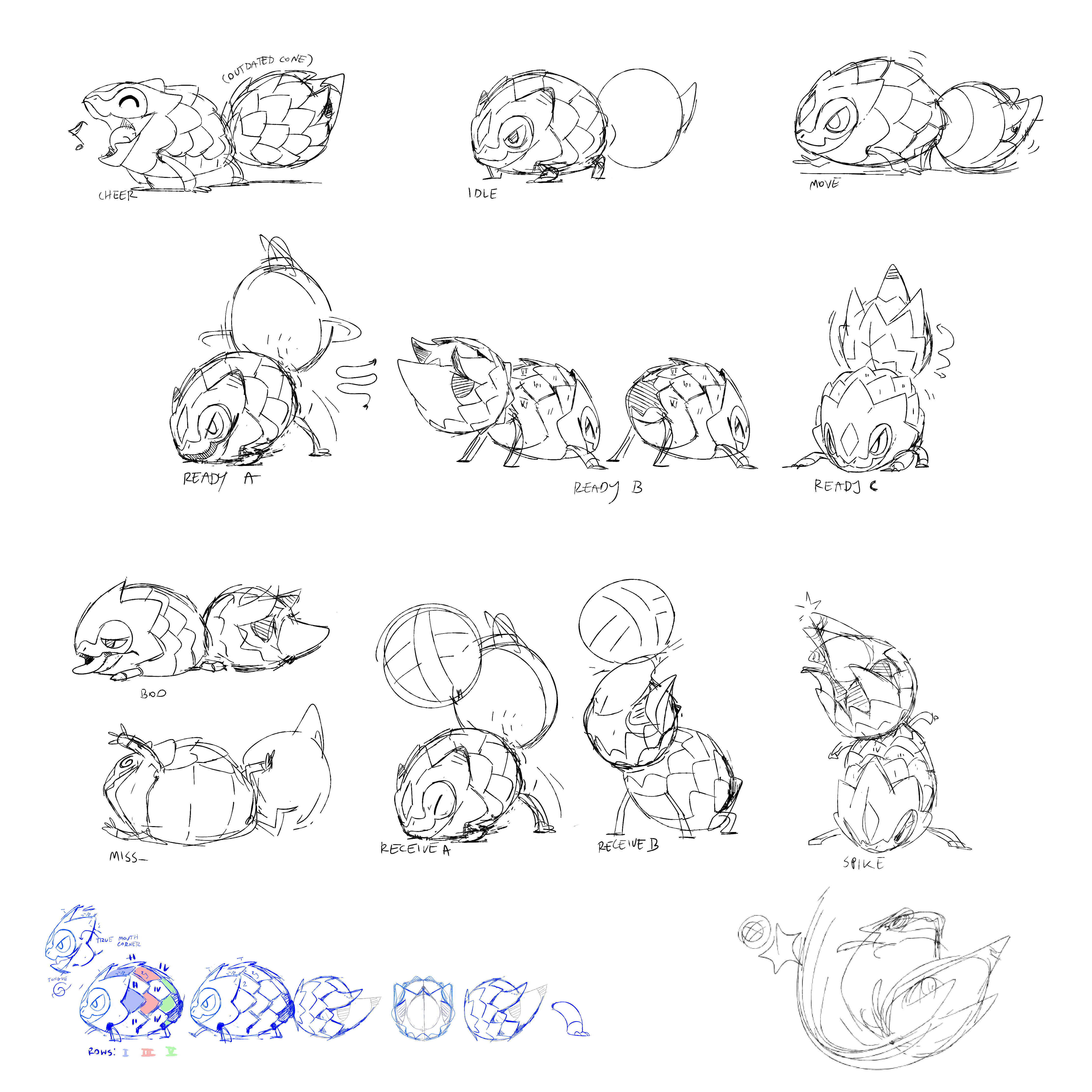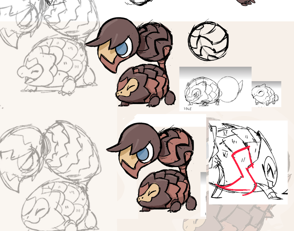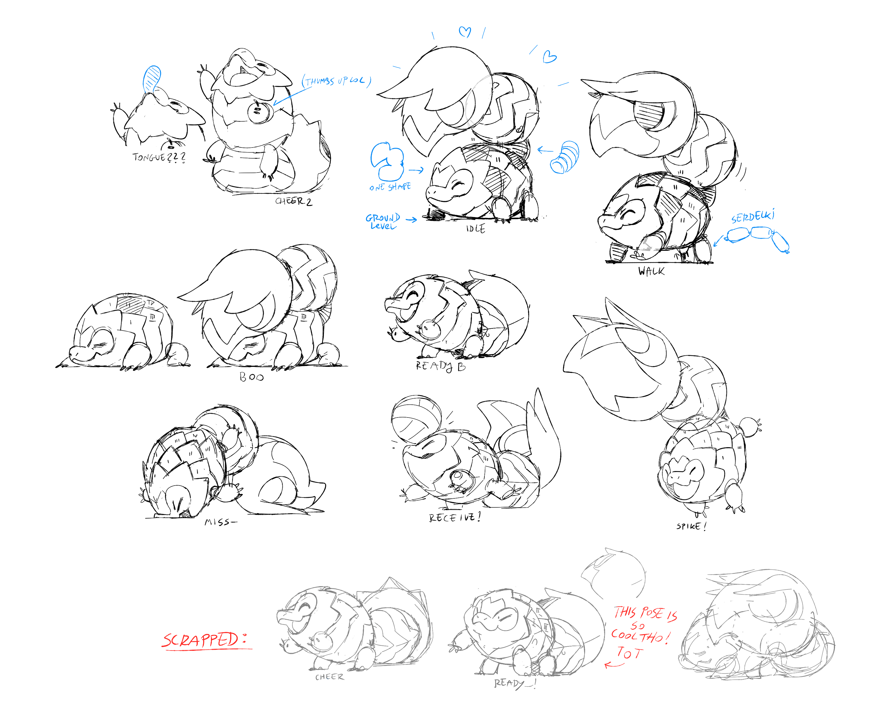 This was when Alexis came back with a few proposals which satisfied everybody; reduced the number of scales to simplify animation, and a few adjustments to the tail size, joint side, and joint position so that it would be usable but mostly out of the way/hidden by posing. I think this stands as a prime example of the advantages we get from animating our designs in 2D rather than 3D, allowing us to cheat our angles and composition to express exactly the geometry we want players to see, without concerns of a spinning camera.