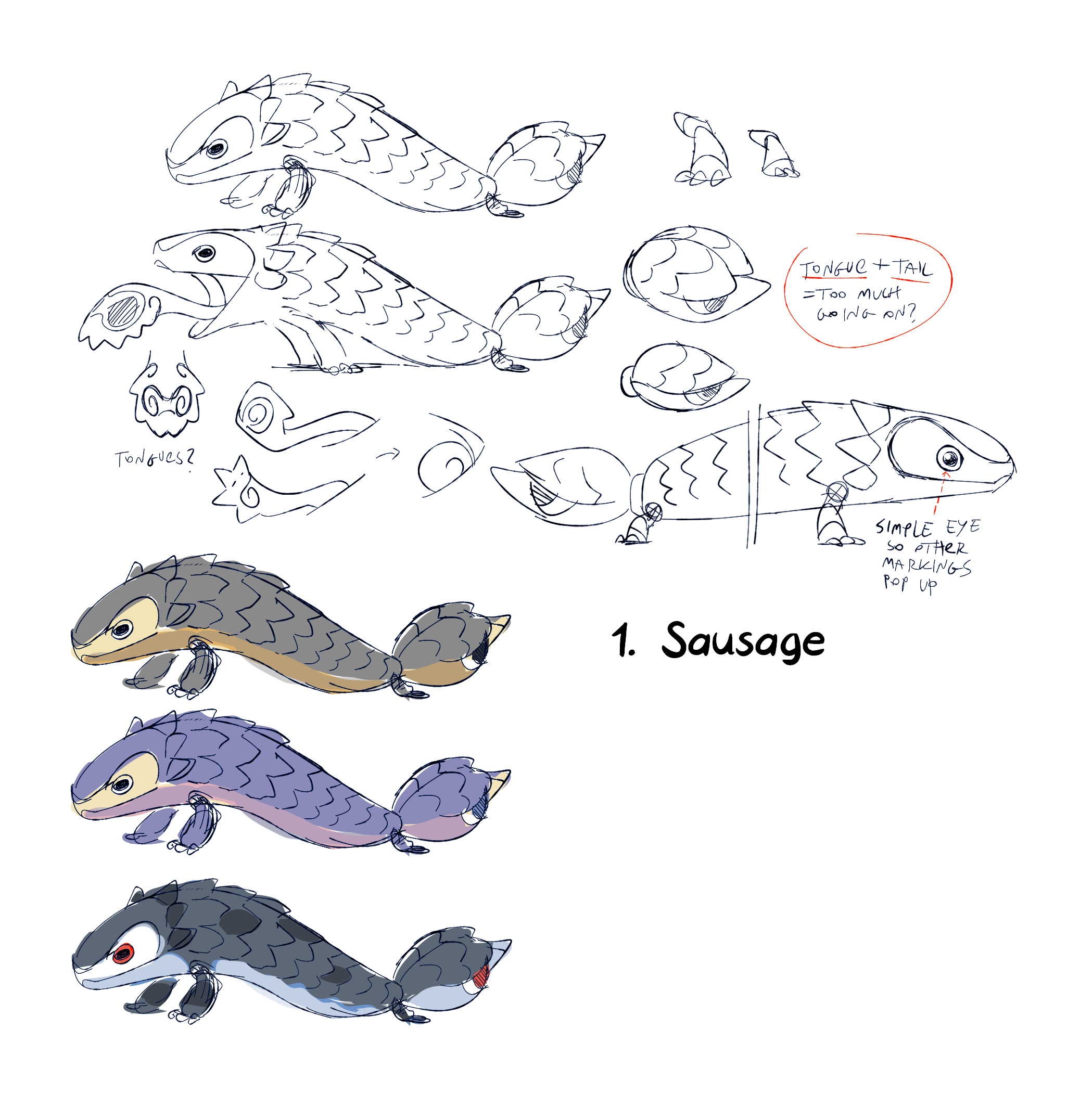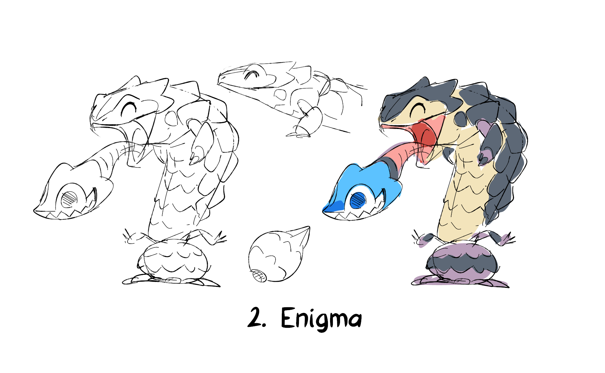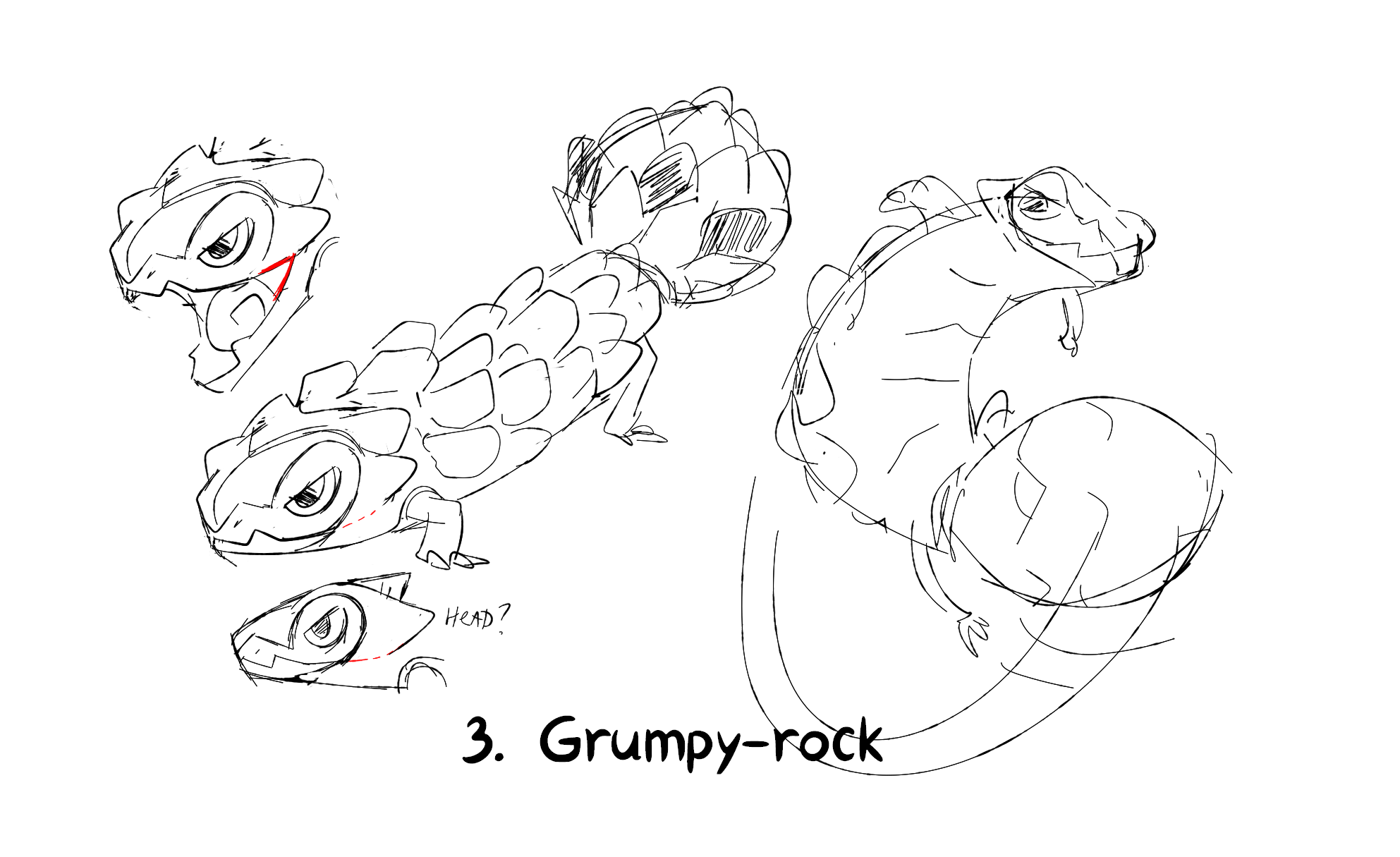 Aside from sketched Beastie stats and playstyles, from early on we had a plan of different environments we needed to fill with Beasties based on where and when players would encounter them. So we knew we’d need a multi-form cave Beastie that players could find early on and grow into something later, possibly inspired by some sort of lizard. That was the prompt Karolina ‘Twarda’ Twardosz ran with when she came to us with these ideas.