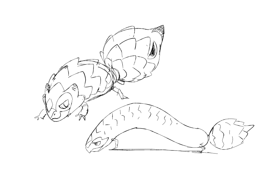 Twarda built up a robust pose library for the Beastie that would become Skorock, and during the same period started exploring more shapes for the "adult” skink. Something overtook her, though, because at the same time she posted these poses, she also shared this sketch of an immature form, apologizing that she’d brought this unexpected design home with her, but admitting that she’d already fallen in love with it. And after we saw it, we couldn’t help but fall in love as well.
