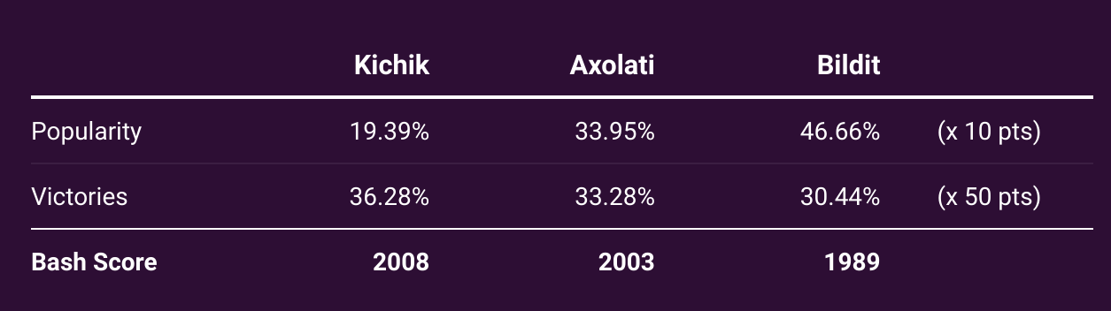 For the first time, the bash also had a theme; it was a contest between Kichik, Axolati, and Bildit, and 3 Beasties players can choose as their starter. Every player had to use EXACTLY one Beastie related to one of these 3, with their results contributing to that Beastie’s global score. Here are the final results!